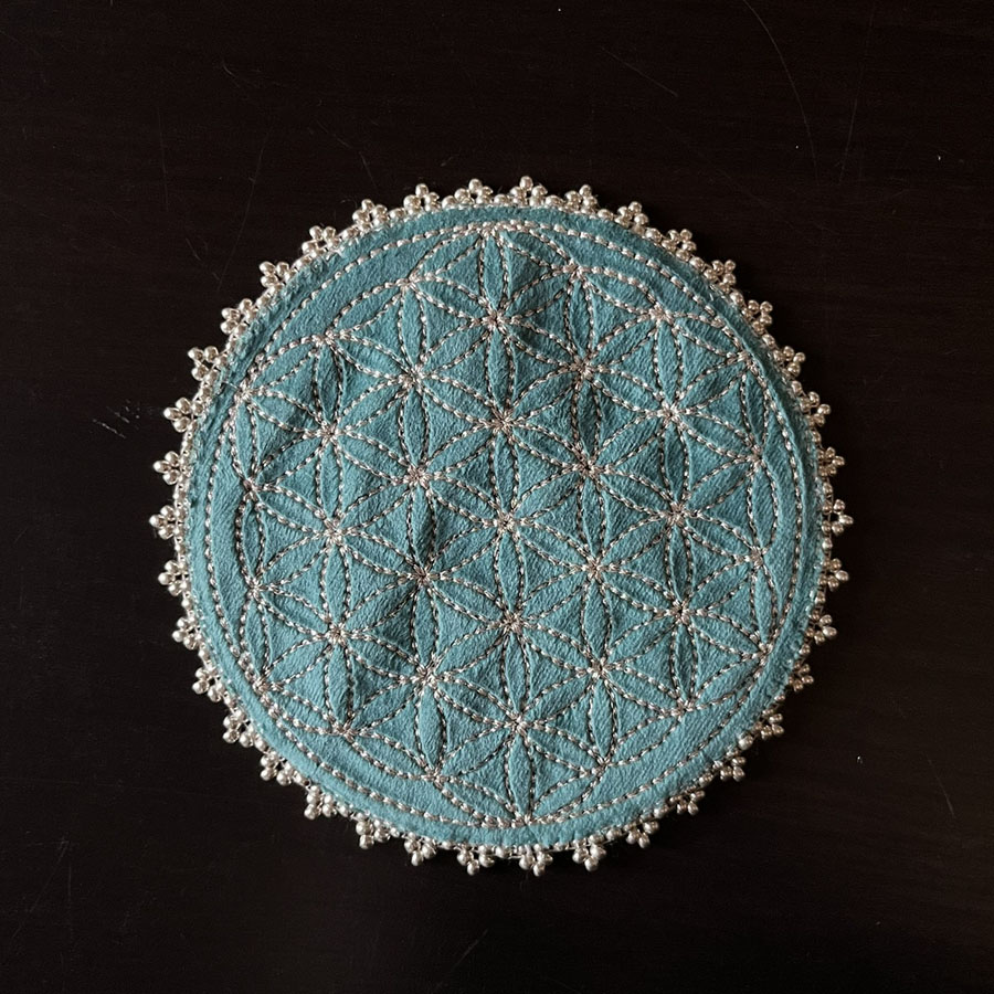 Fleur de vie velours vert emeraude, broderie argentée et perles argentées