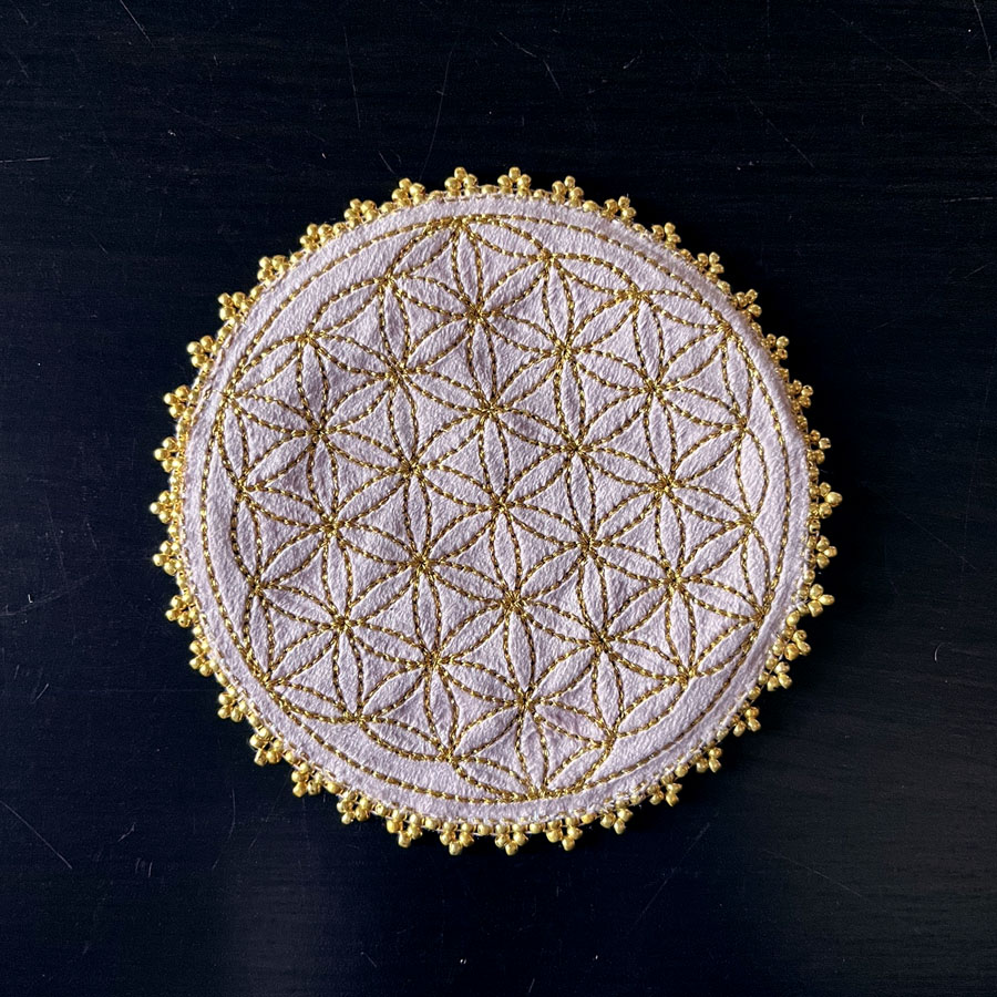Fleur de vie velours rose pastel, broderie dorée et perles dorées