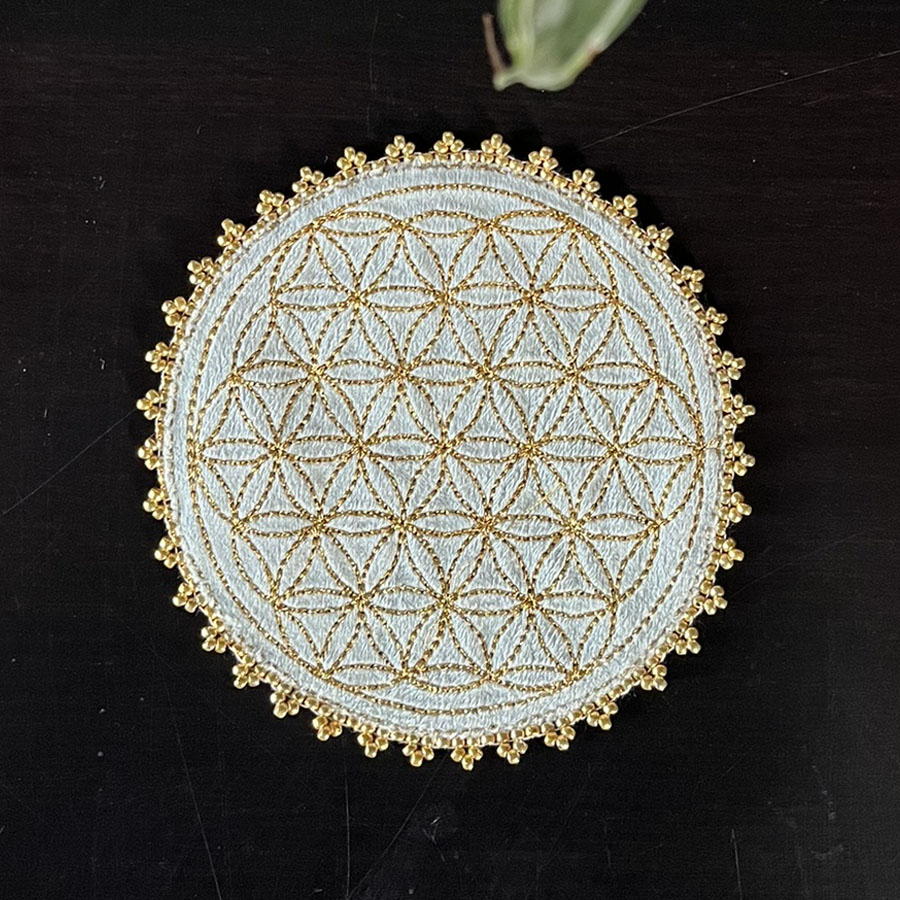 Fleur de vie velours vert pastel, broderie dorée et perles dorées