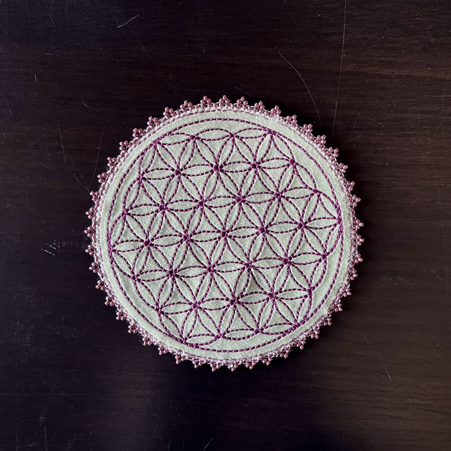 Fleur de vie velours vert pastel, broderie violette et perles violette